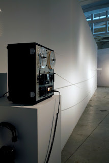 The duration of the recording corresponds with the distance from the machine to the carabiner, it starts in the machine and finishes in the carabiner twelve metres away, allowing the viewer to follow visually the duration of the sound in the space, from the reel to reel tape recorder to the carabiner.